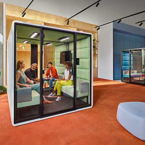 hushFree.M phone booth は、チームミーティング、ハイブリッドワーク、機密性の高い会話に最適な高品質な防音オフィスブースです。最大4人が利用でき、集中したディスカッションや効率的な作業環境を提供します。Aクラスの防音性能と高度なLED照明を備え、プライバシーを守りながら、ビデオ会議のプロフェッショナルな品質を確保します。
